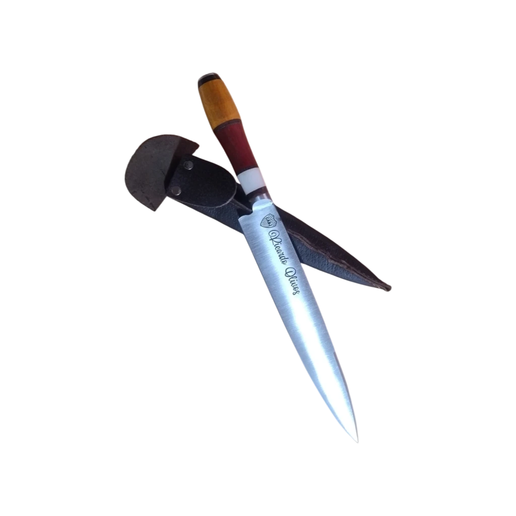 Nuestro cuchillo artesanal en acero inoxidable con vaina de cuero clásica es el compañero perfecto para quienes disfrutan de un buen asado y valoran la calidad en cada detalle.