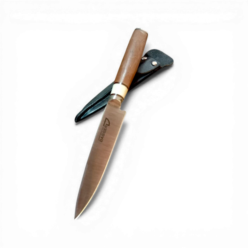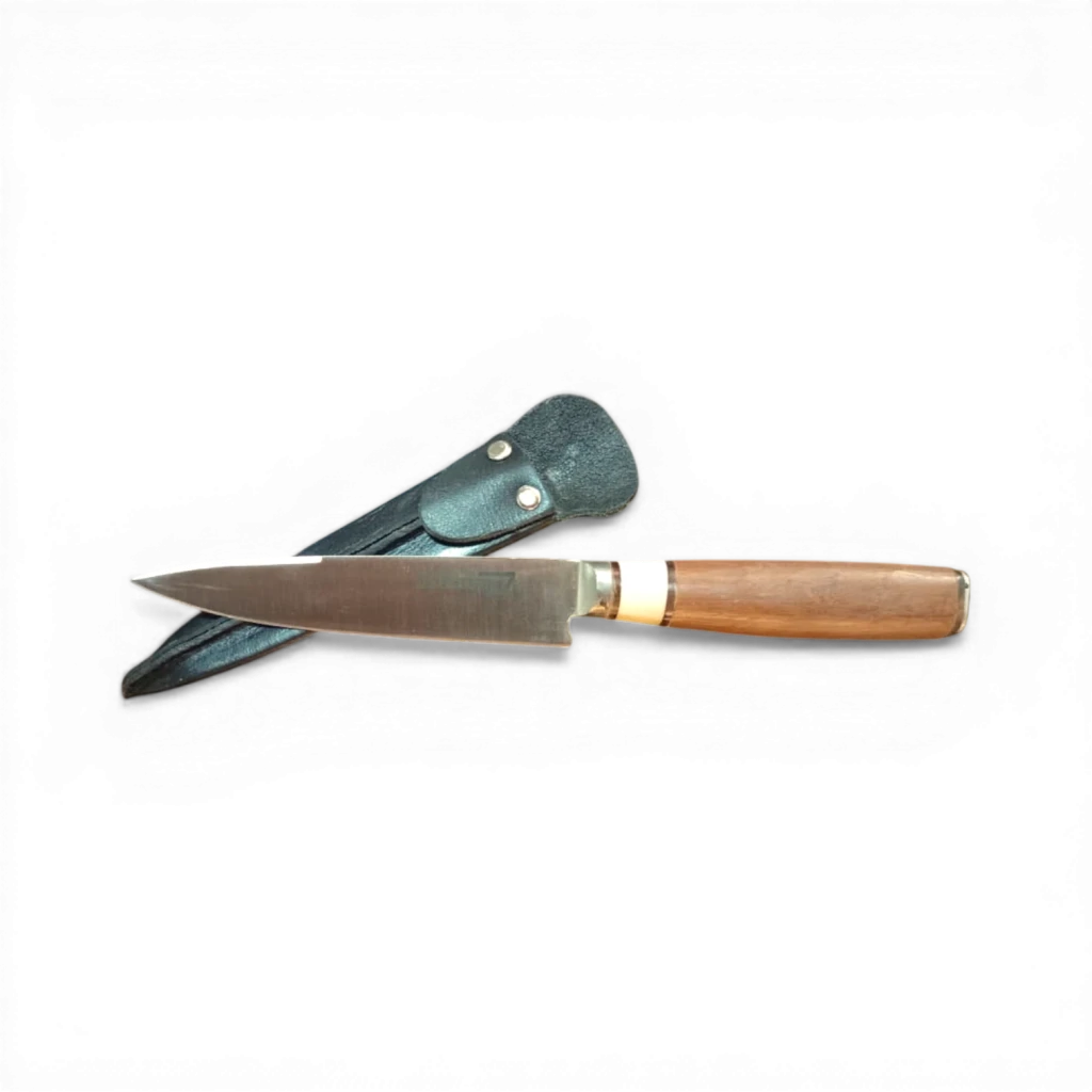 Nuestro cuchillo artesanal en acero inoxidable con vaina de cuero clásica es el compañero perfecto para quienes disfrutan de un buen asado y valoran la calidad en cada detalle.
