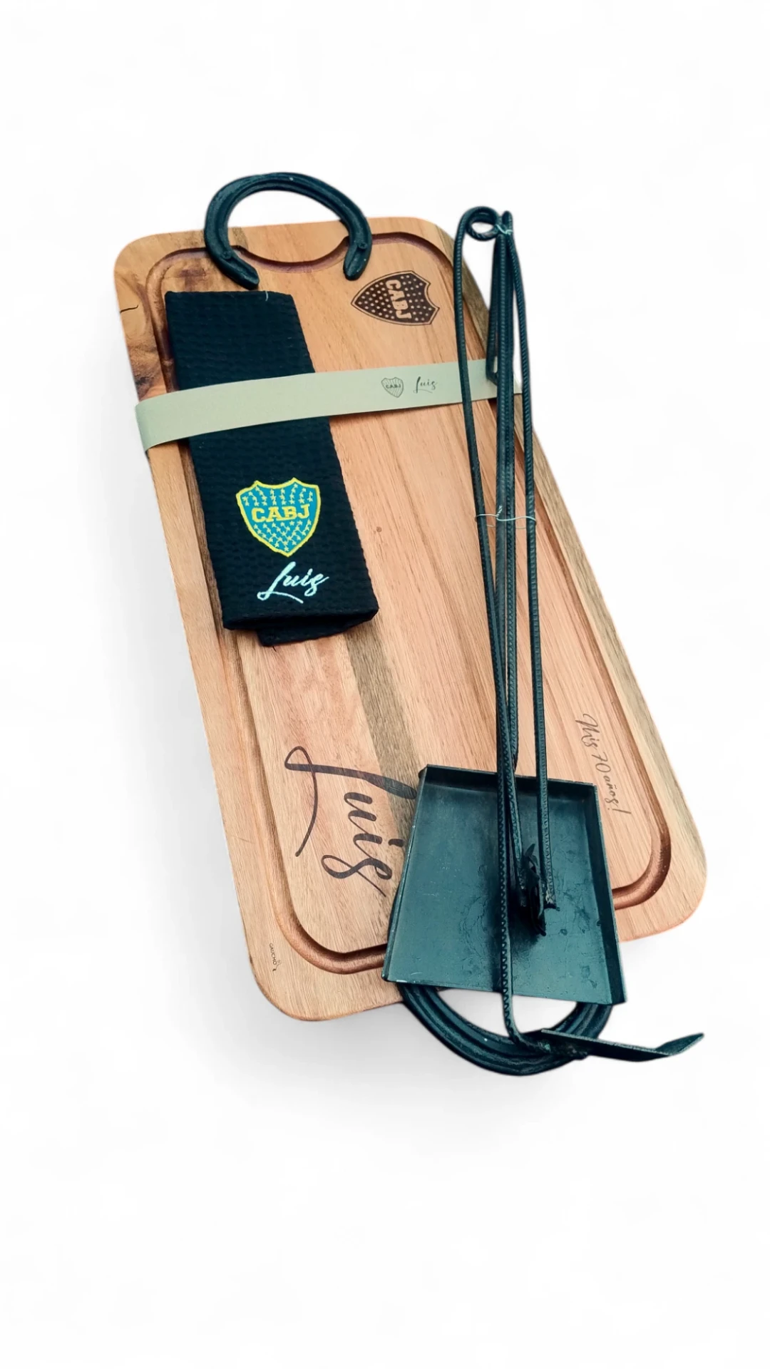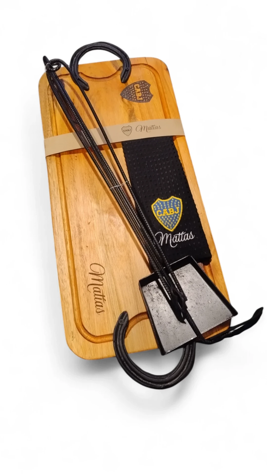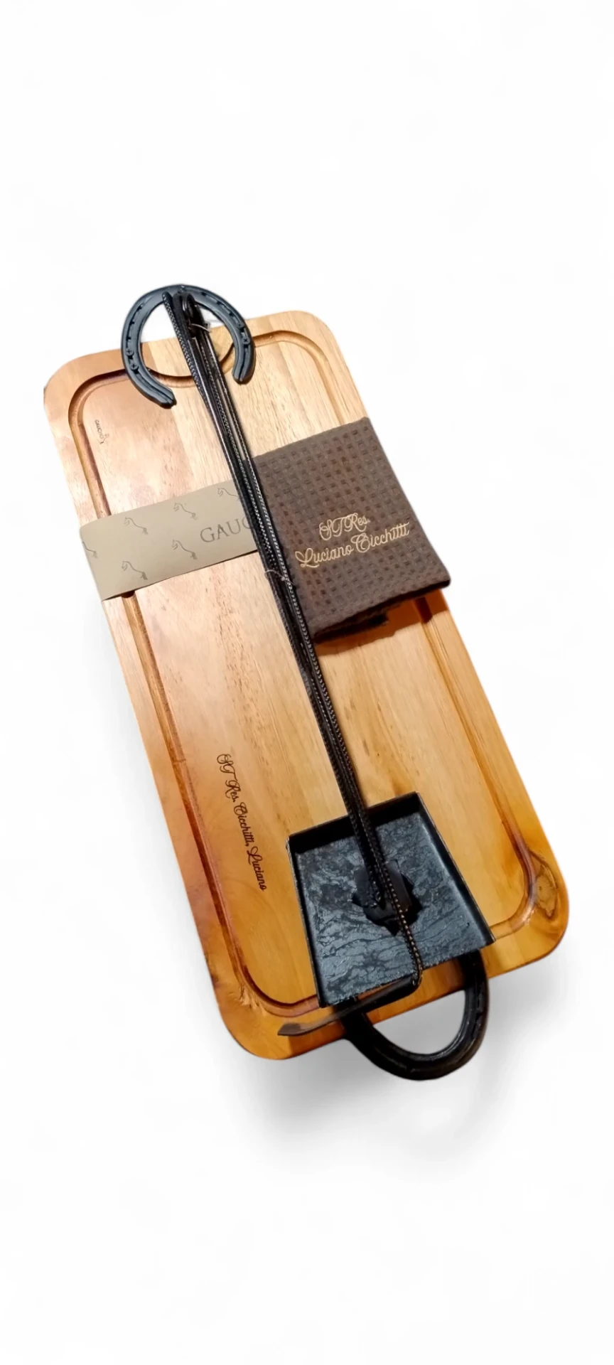 - Tabla de eucalipto colorado (60x30 cm) con herraduras auténticas de caballo en fundición de acero – doble curado con vaselina y cera de abejas para mayor protección y durabilidad.