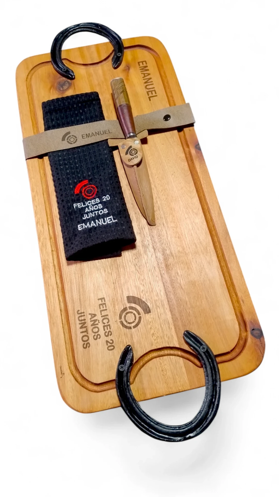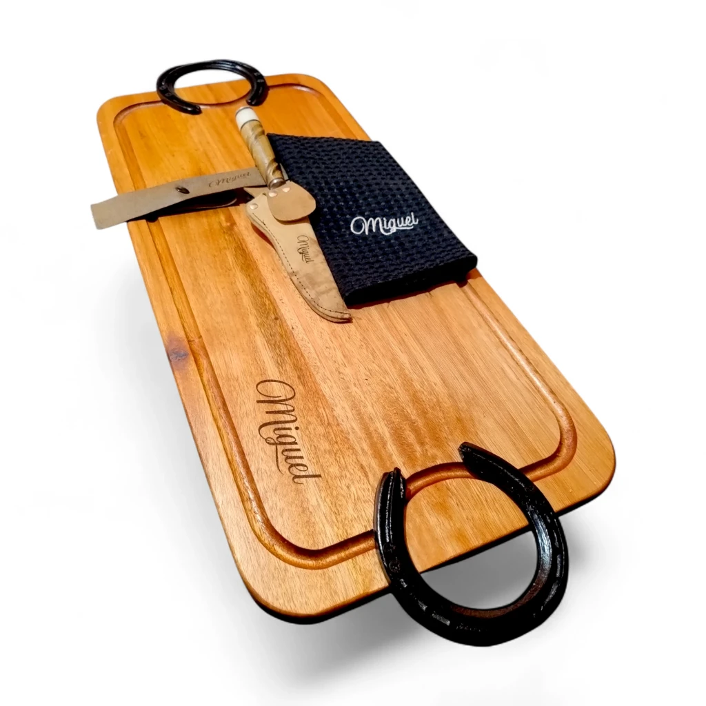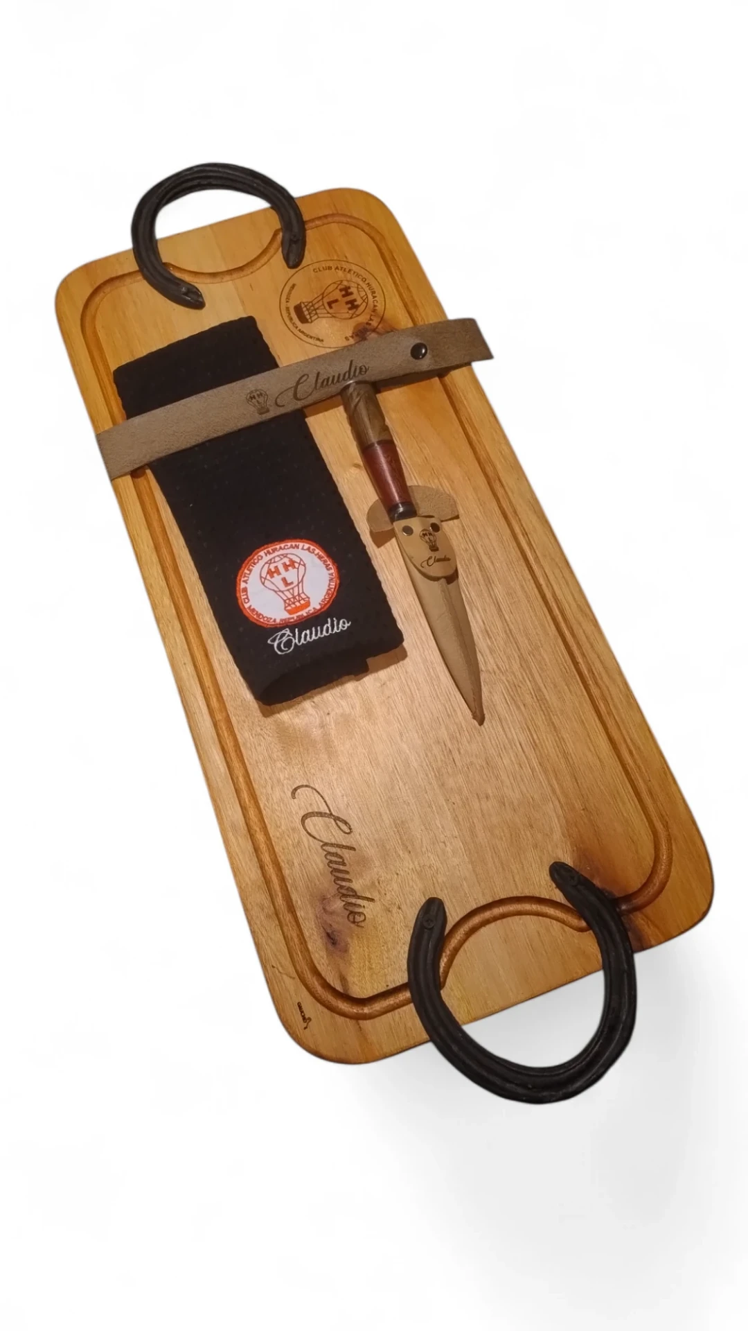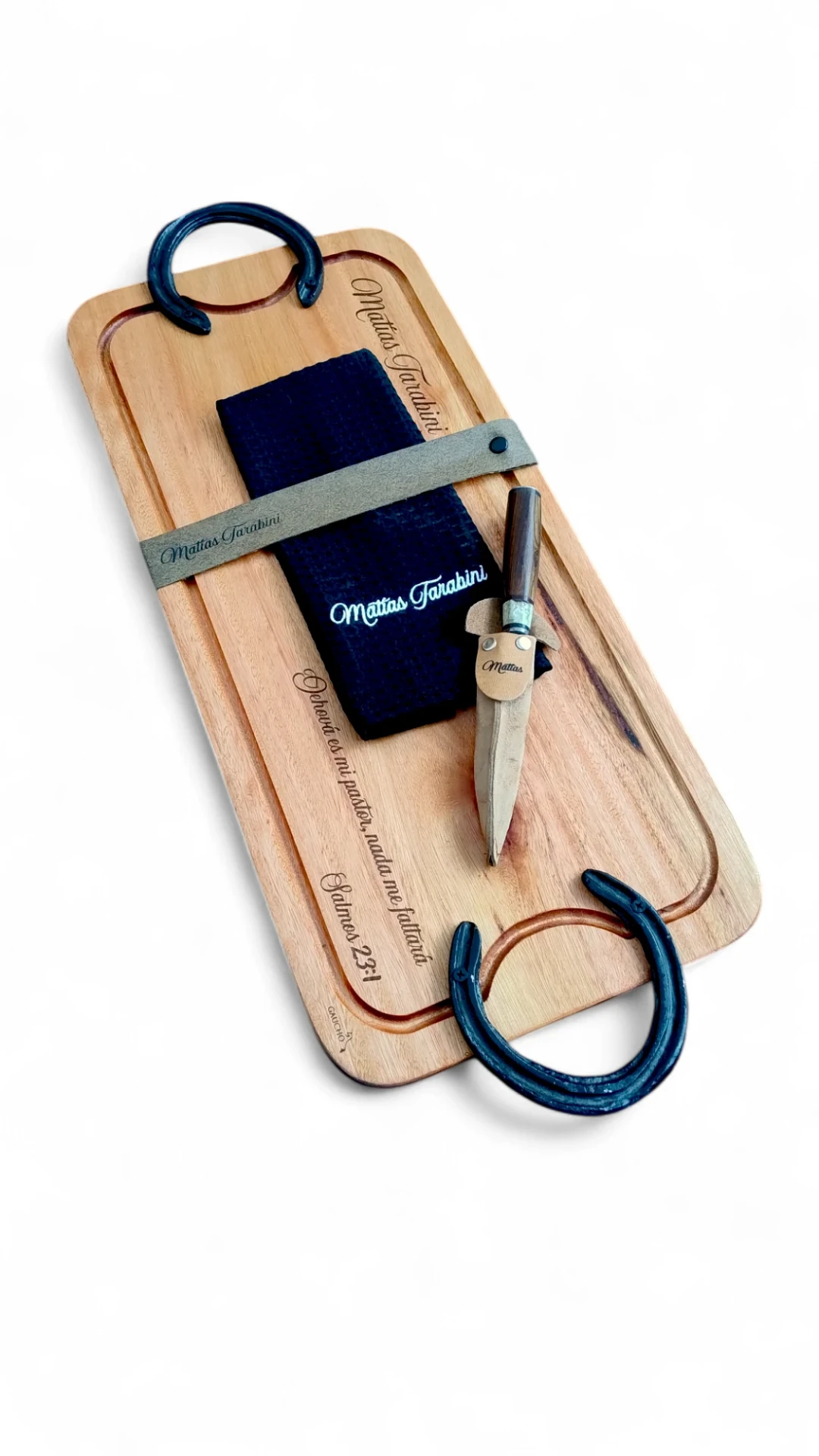 - Tabla de eucalipto colorado (61x29,5 cm) con herraduras en fundición de acero – doble curado con vaselina y cera de abejas para máxima protección y durabilidad.