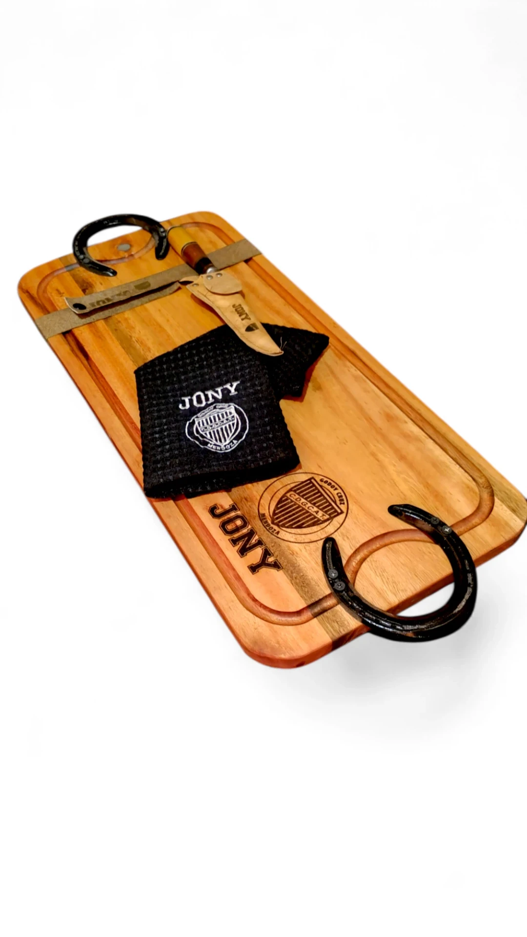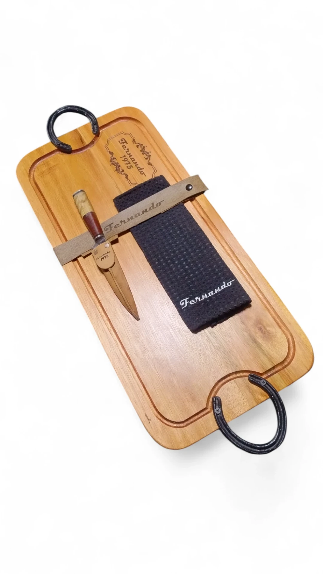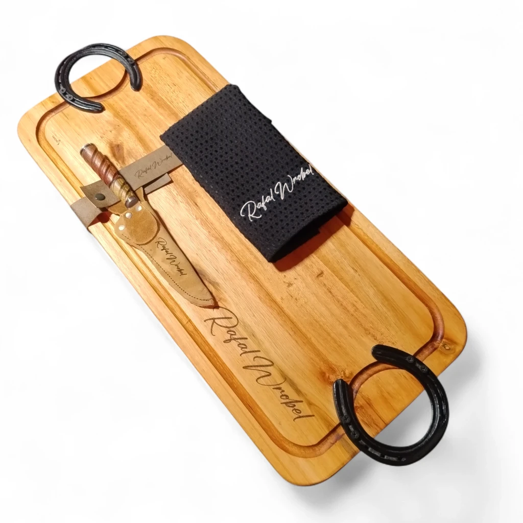 - Tabla de eucalipto colorado (61x29,5 cm) con herraduras en fundición de acero – doble curado con vaselina y cera de abejas para máxima protección y durabilidad.