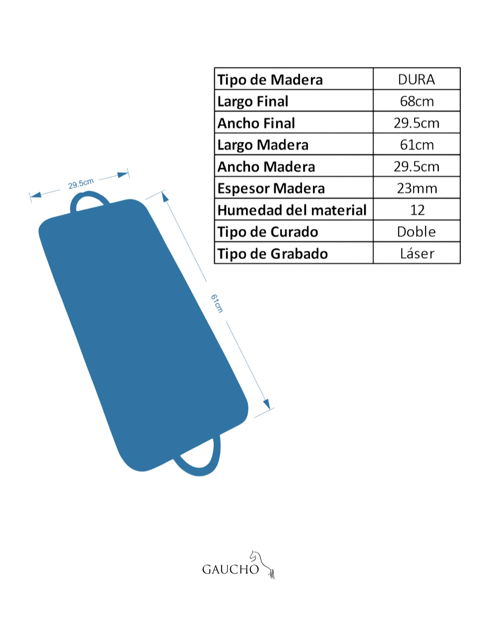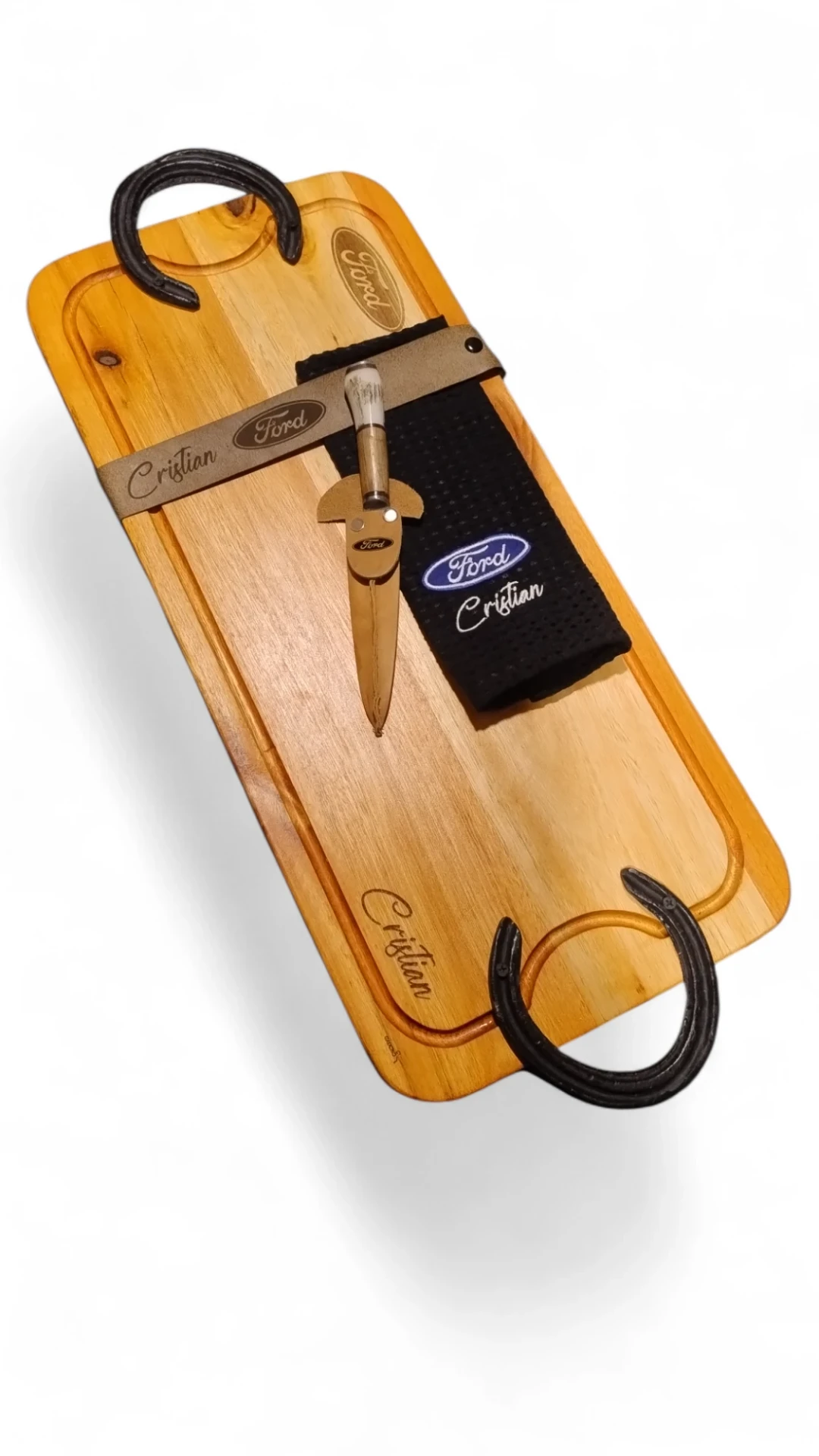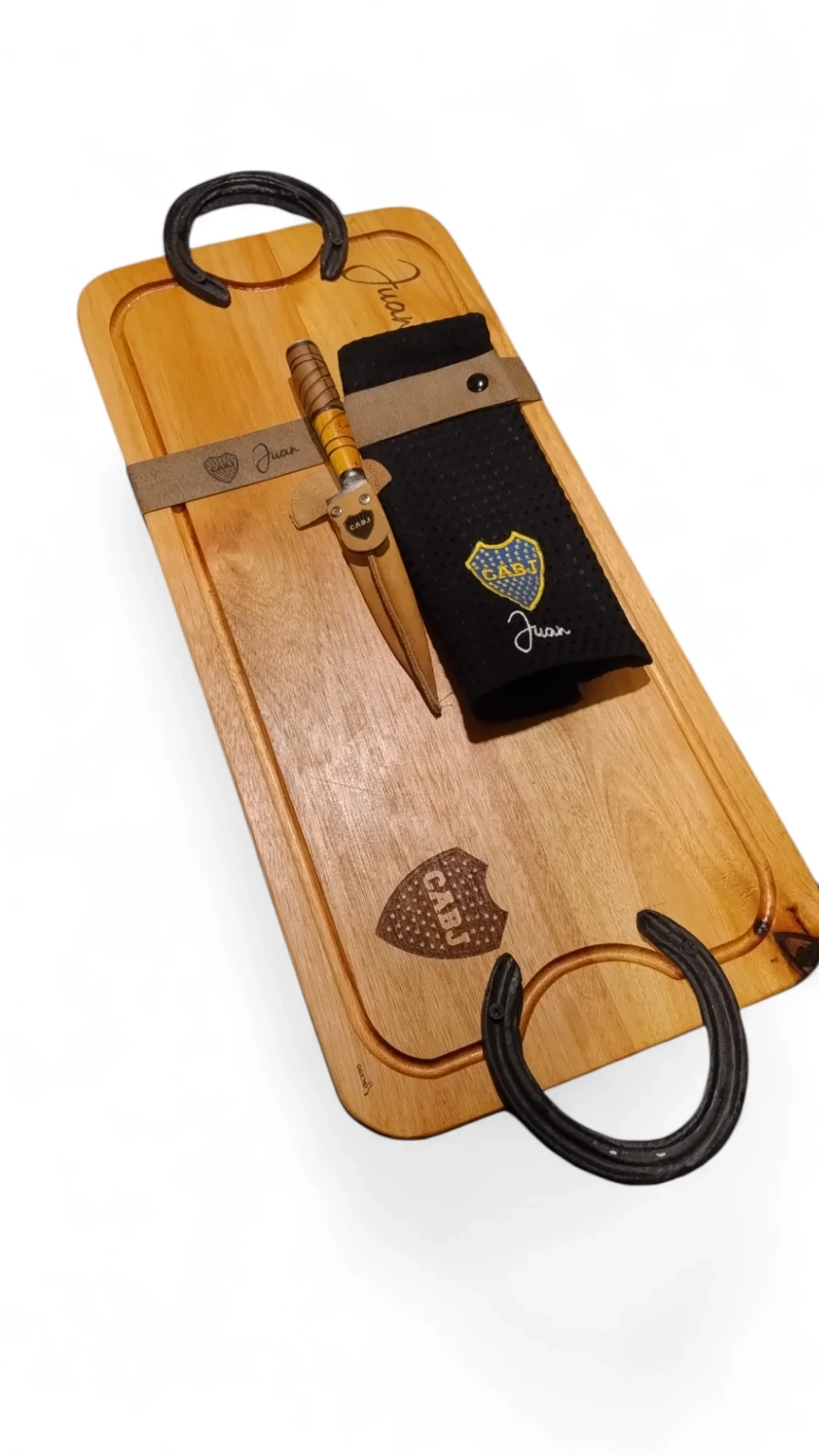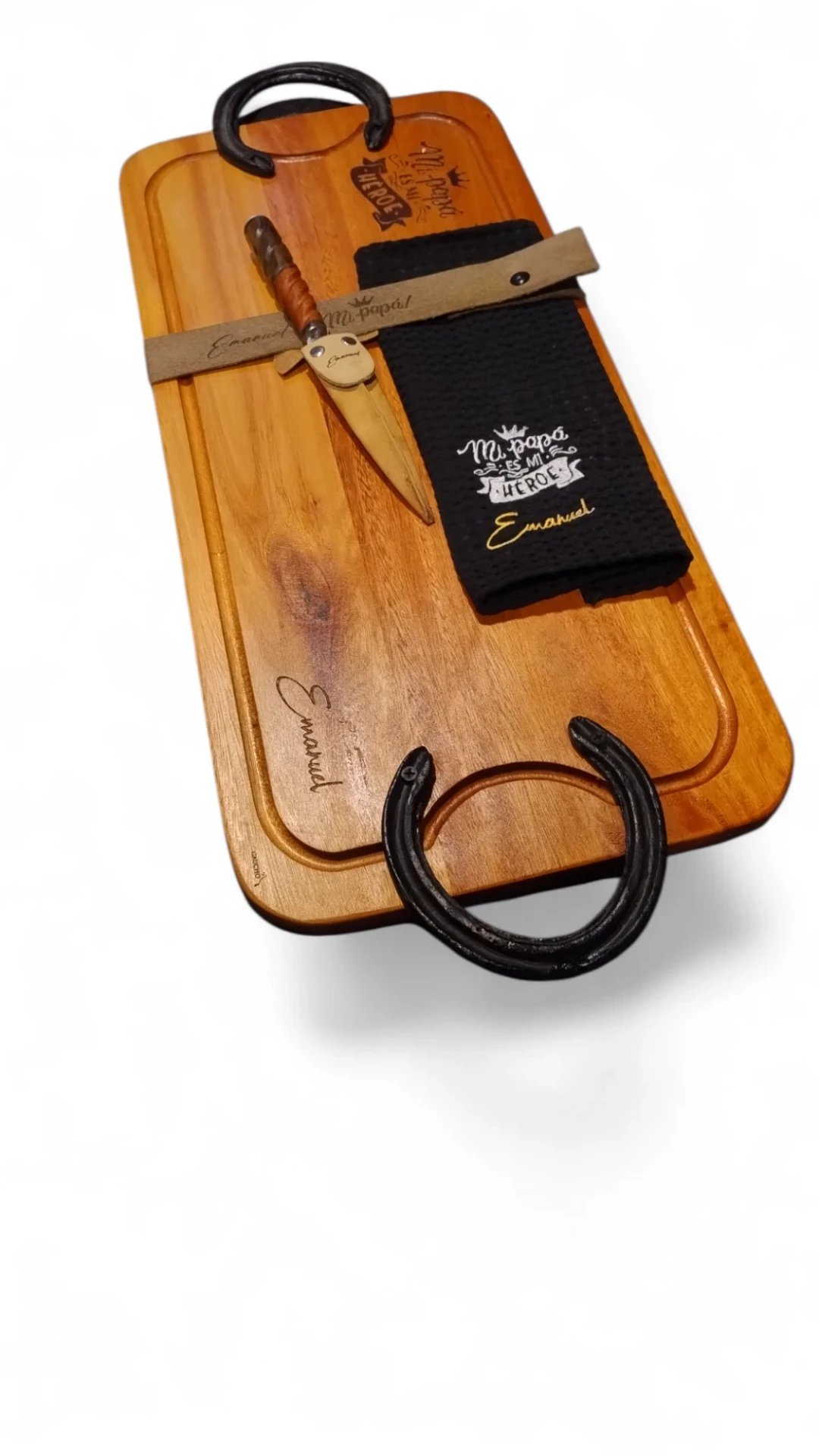 - Tabla de eucalipto colorado (61x29,5 cm) con herraduras en fundición de acero – doble curado con vaselina y cera de abejas para máxima protección y durabilidad.
