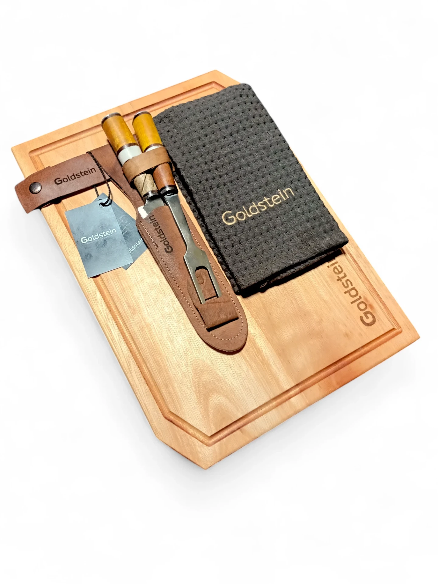 - Cuchillo y tenedor de acero al carbono con vaina de cuero vacuno grabada.