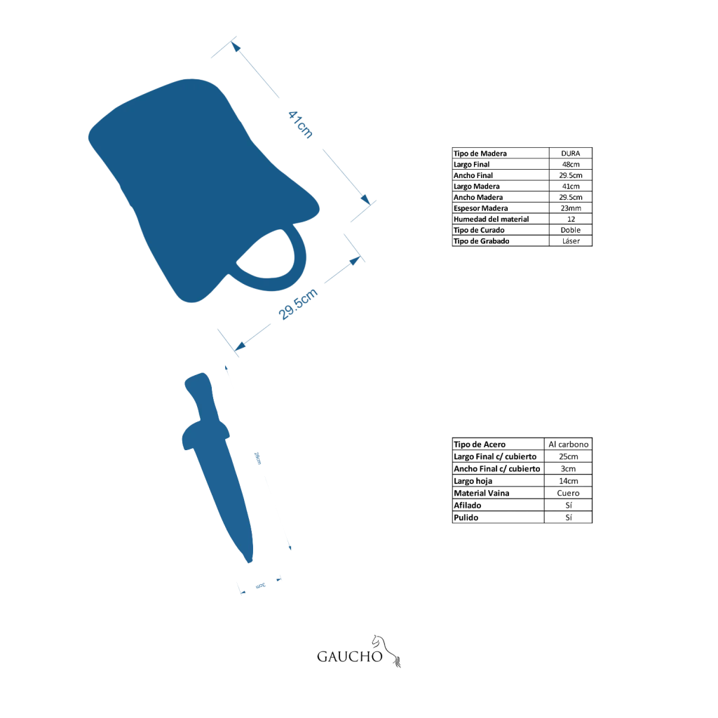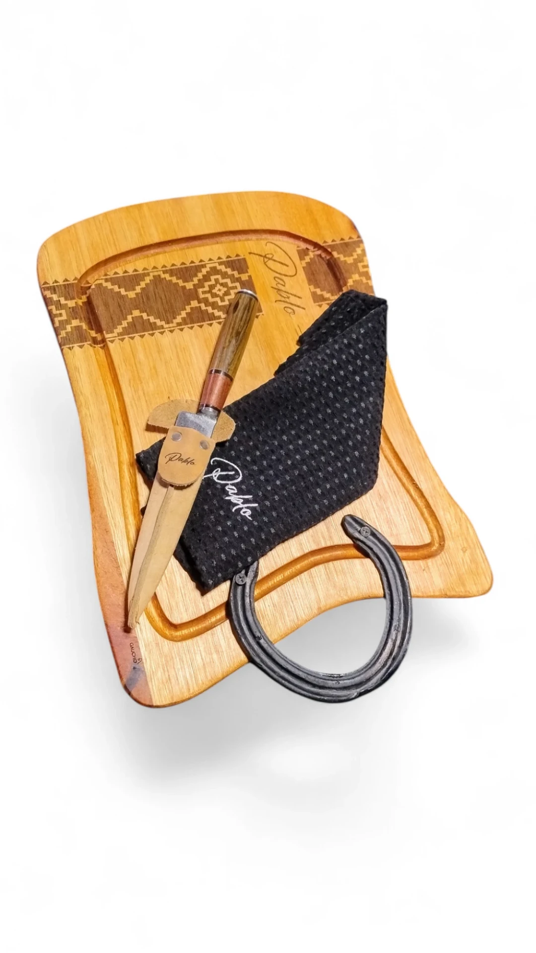 Nota: Imágenes ilustrativas; colores de repasador y faja, tonalidad de la madera, cabos de cuchillo o vaina pueden variar, resaltando el carácter artesanal y único de cada pieza.